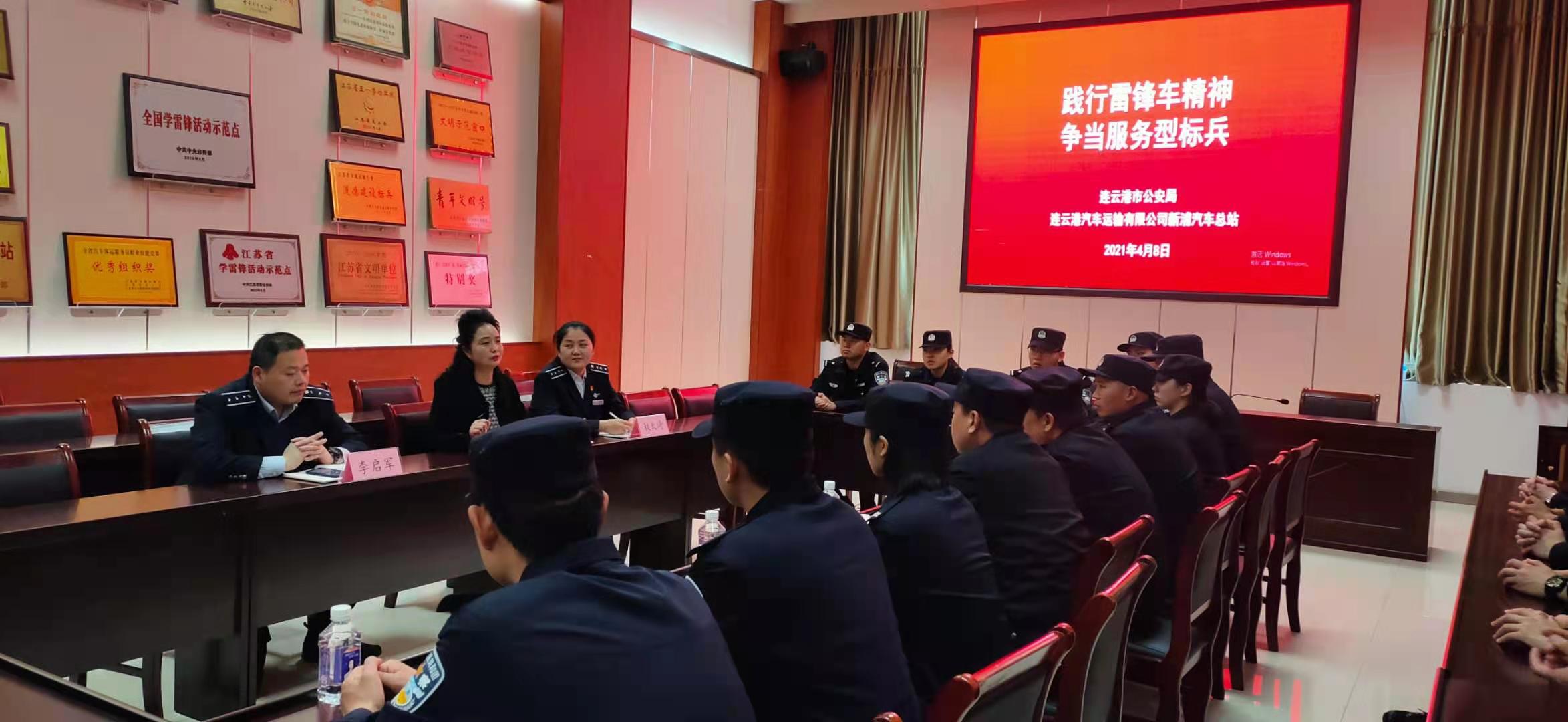 为扎实开展公安队伍党史学习教育活动,提高新入职民警的使命感和责任感,4月8日下午,连云港市公安局政治处副主任田克前一行20人到新浦汽车总站开展“践行雷锋车精神,争当服务型标兵”座谈会。连云港汽车运输有限公司副总经理、工会主席王有利及新浦汽车总站相关领导参加了座谈会。