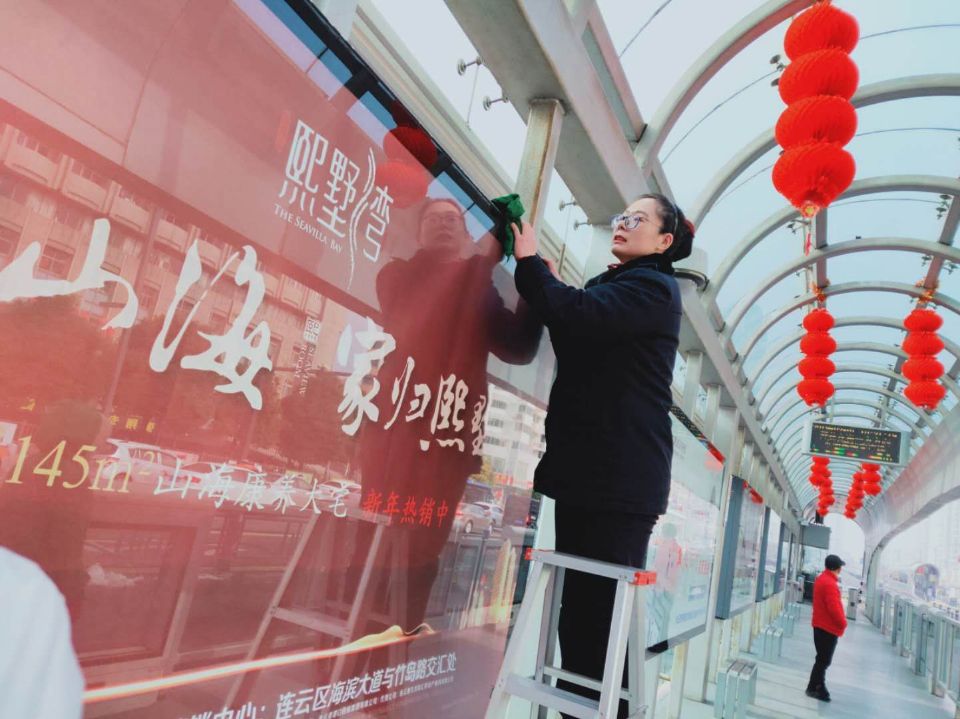 站台的广告灯箱顶部位置比较高,够不到使不上劲,就容易形成了卫生死角,为了站台彻底洁净、明亮,嘉瑞宝站台的站务员金莉娜和孙艳俩人就自己掏钱买来梯子,放在站台里方便擦广告灯箱使用。