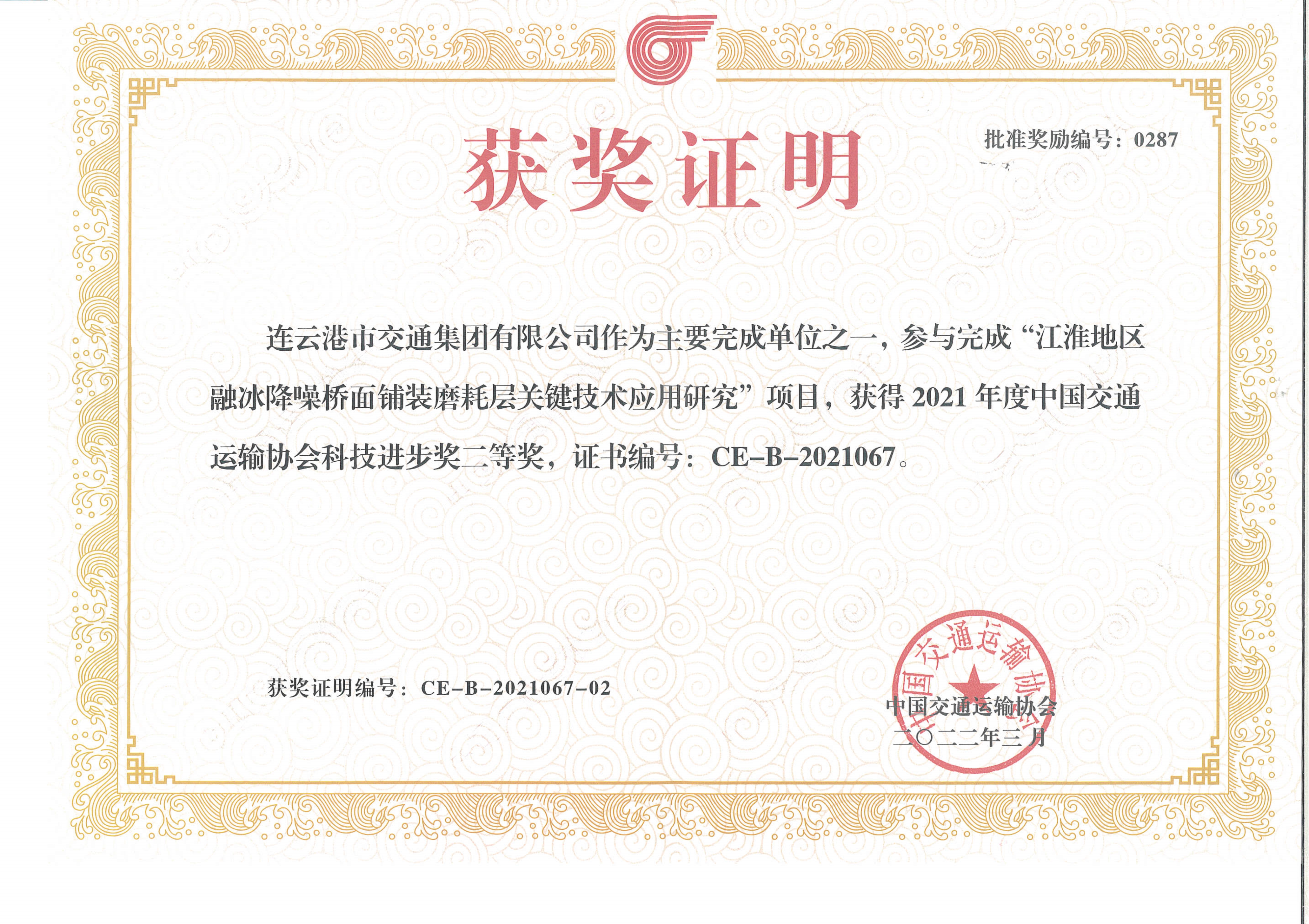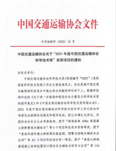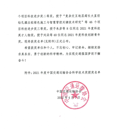 近日,中国交通运输协会发布了“2021年度中国交通运输协会科学技术奖”获奖项目名单,交通乐动app最新版下载,乐动(中国)联合苏交科乐动app最新版下载,乐动(中国)等单位申报的“江淮地区融冰降噪桥面铺装磨耗层关键技术应用研究”项目荣获中国交通运输协会科技进步奖二等奖。