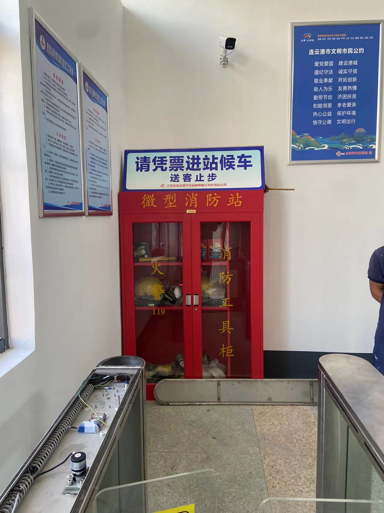 此次消防设施维护改造对新候车室更换所有消防设并增加了微型消防站,清除出口障碍物,确保出口标识灯明亮;对室外消防栓重新刷漆保养,办公楼的应急标识进行检查更换;检查应急灯等设备的电路、防火线,以及检查灭火器的使用时效性,站场设置防火沙场地,保障防火沙充足。