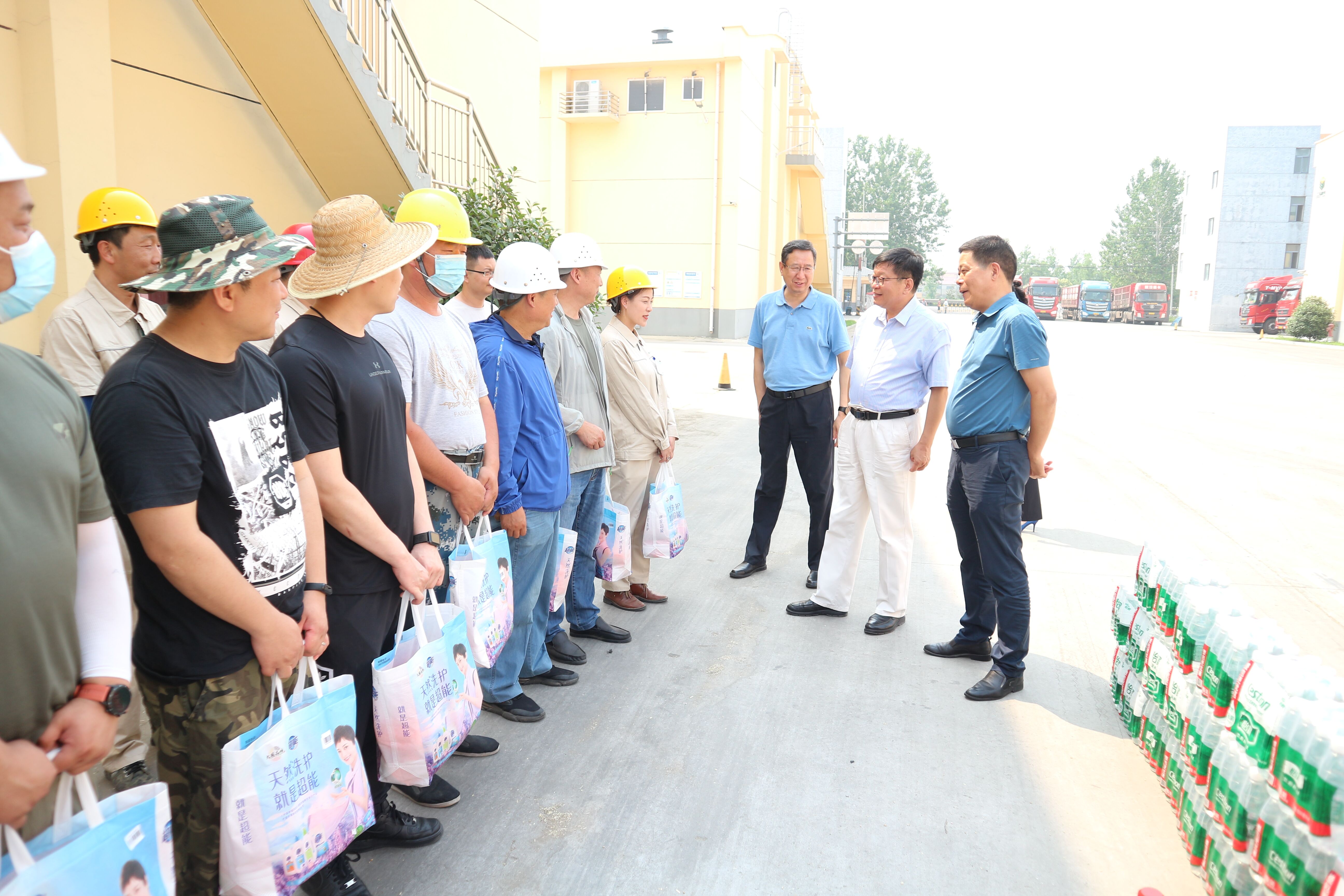 在夏粮收购现场,刘永能一行详细了解了今年小麦收购进度,以及小麦收购、化验、结算、入库等工作流程,对和茂工作人员战高温、斗酷暑、强技能,全力抓好夏粮收储工作给予了高度评价。随后,他又到检测中心等生产一线询问了解员工工作生活情况,给他们送去了慰问品,叮嘱他们要加强防暑降温,做好安全防护,合理安排工作和休息时间。