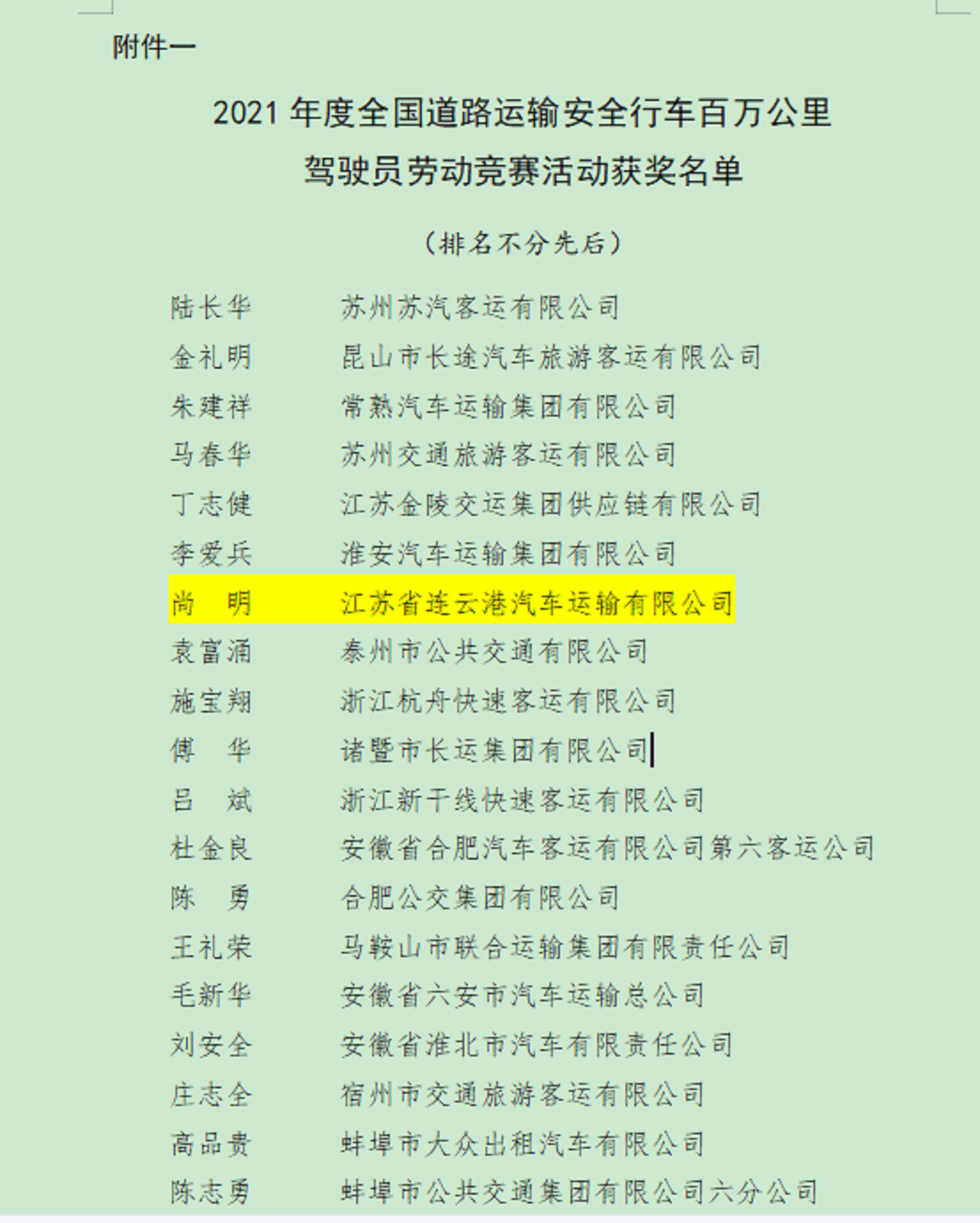 近日,2021年度全国道路运输安全行车百万公里驾驶员劳动竞赛活动获奖名单公布,连云港市交通控股乐动app最新版下载,乐动(中国)汽车公司客运事业部驾驶员尚明获得连云港市唯一一名“全国道路运输安全行车百万公里优秀驾驶员”荣誉称号。