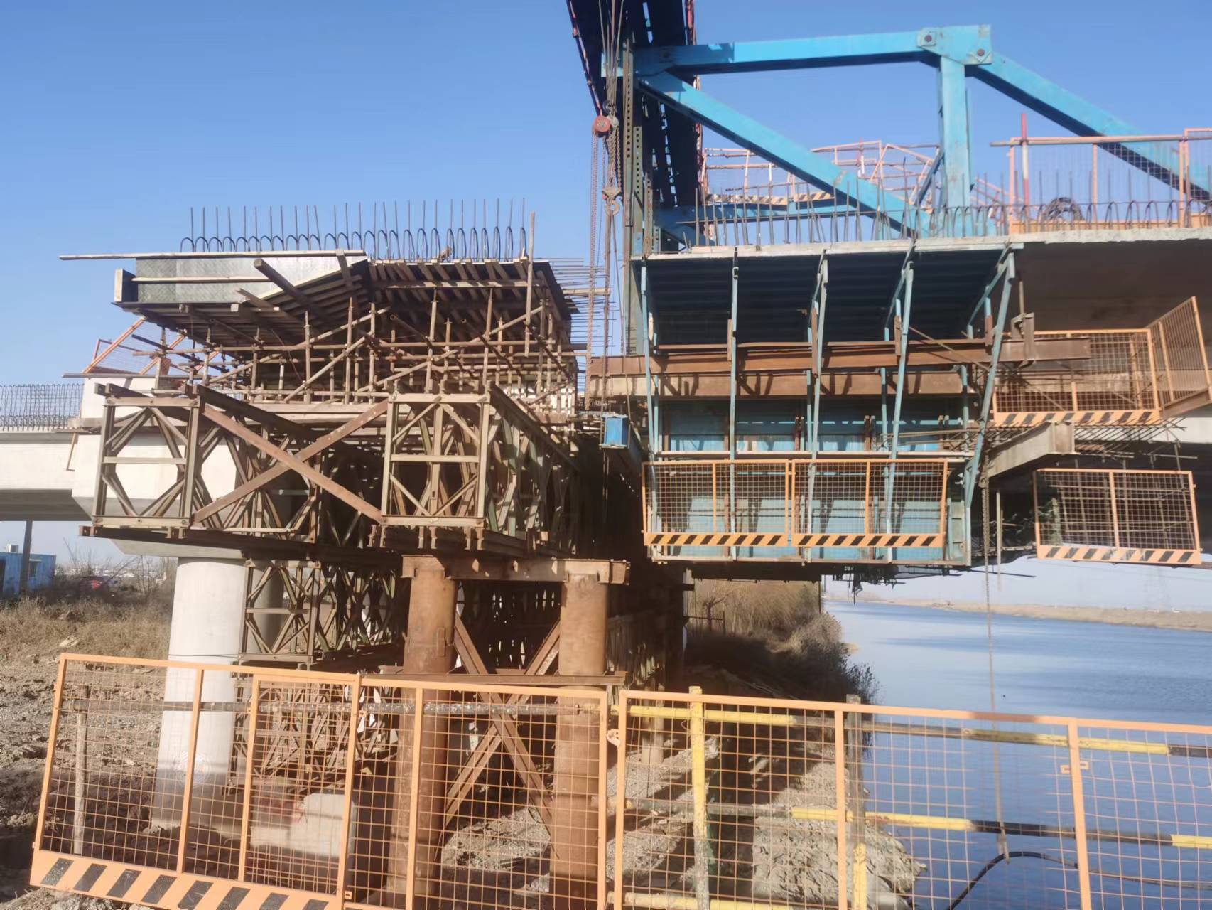 沭北运河大桥挂篮悬臂施工包括墩顶0号段、悬臂浇筑段1#~7#段、边跨合龙段、中跨合龙段及边跨现浇段施工。本次浇筑的边跨现浇段位于西岸左幅9#墩,采用满堂支架工艺施工,共浇筑C50混凝土52.5m3。沭北运河大桥第三联跨苏北通榆运河,其主桥箱梁跨径布置为36米+60米+36米,是402省道赣榆南环段工程全线唯一采用悬臂浇筑施工法的预应力连续箱梁,跨径大、节块多,施工难度高。