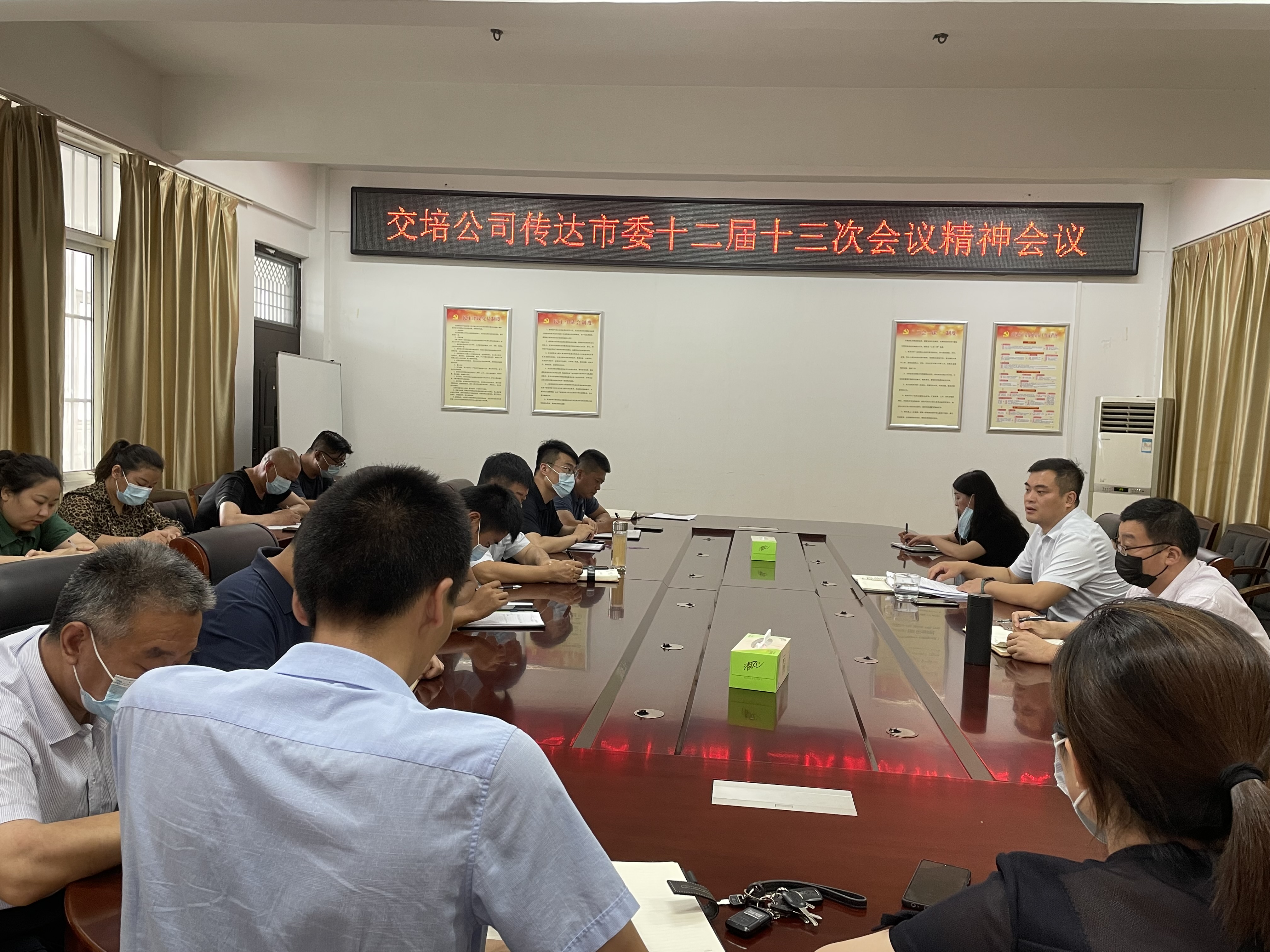 2021年8月11日下午,交培公司召开传达市委十二届十三次会议精神会议,公司领导班子及所有中层干部参加会议。